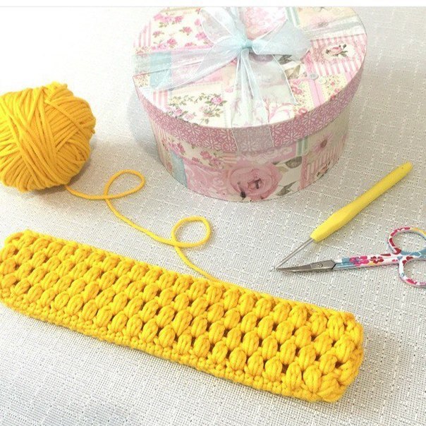 На заметку! На полотне получатся выпуклые дорожки, если провязать рельефные столбики б/н. Для этого крючок цепляется не за обе стенки, а за заднюю или переднюю половинку петельки предыдущего ряда. Сложите готовую деталь на сгибах. Боковые швы соедините иглой с нитью. Крышка снабжается ручками и магнитным замочком.
