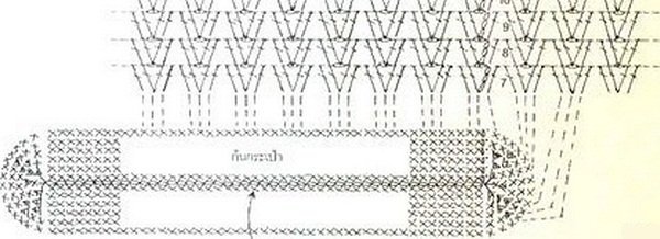 Опытная мастерица Хелен Марет из Португалии создала свою авторскую схему. Оригинальность идеи в выполнении полукруглых рядов, которые красиво ложатся и украшают модель. Толстым крючком №9-10 набирается цепочка из 23 воздушных петель, а потом по схеме вокруг цепочки вяжутся незаконченные ряды.