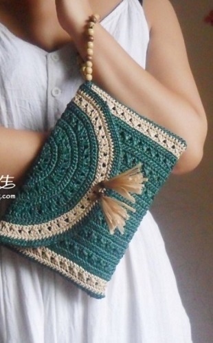 Красивый клатч связан из пряжи двух цветов. Для вязания клатча использовали пряжу двух, хорошо сочетающихся между собой цветов: изумрудного цвета и бежевого. Клатч застегивается на одну маленькую кнопку-пуговицу, которая украшена кисточками. Клатч вяжется единым полотном. Клатч связан плотным узором, который хорошо держит форму. Ремешок для клатча сделан из деревянных бусин, которые были нанизаны на крепкую нить. Со схемой вязания клатча вы можете ознакомиться далее в статье.