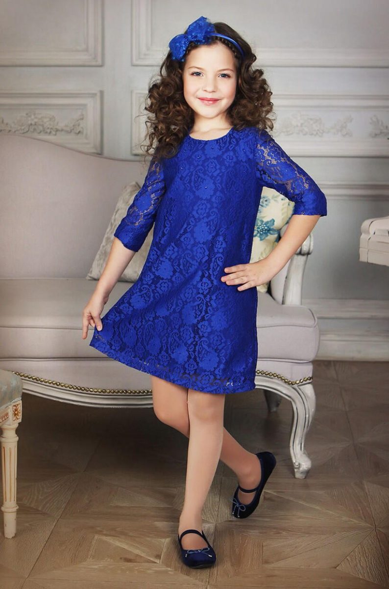 Фасоны платьев с кружевом достаточно разнообразные. И пышное, и бальное, и короткое платье вполне позволяет украсить себя кружевом. Шикарно смотрится контраст. Платье нежно голубого цвета, украшенное ярким васильковым кружевом, приведет в восторг ребенка и ее подружек.